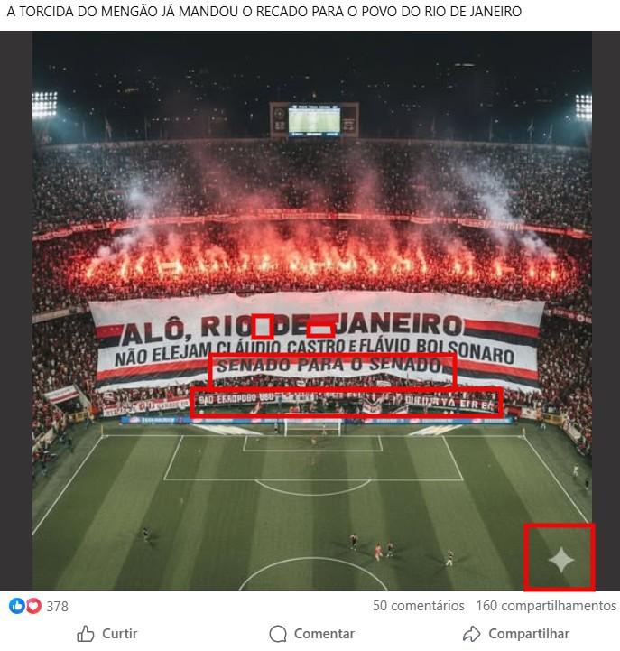 Por exemplo: as palavras ilegíveis exibidas nas faixas menores atrás do gol e, no bandeirão principal, a descontinuidade de listras pretas e vermelhas, e a repetição ilógica da palavra “senado”. Em algumas publicações, o registro também aparece com a marca d’água da Gemini, ferramenta de IA do Google.
