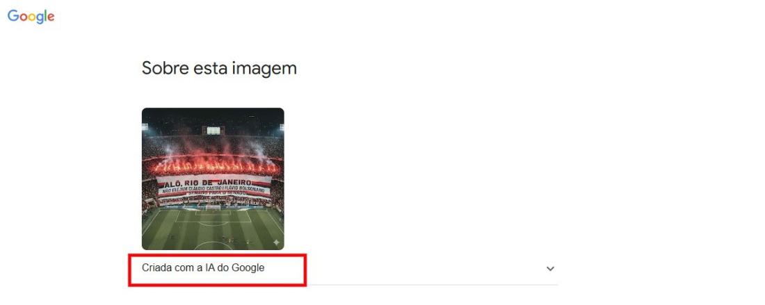 Uma busca reversa pela imagem tampouco mostrou resultados correspondentes. No entanto, na seção “Sobre esta imagem”, disponível na mesma busca, exibe-se uma indicação de que o conteúdo foi criado “com a IA do Google”.