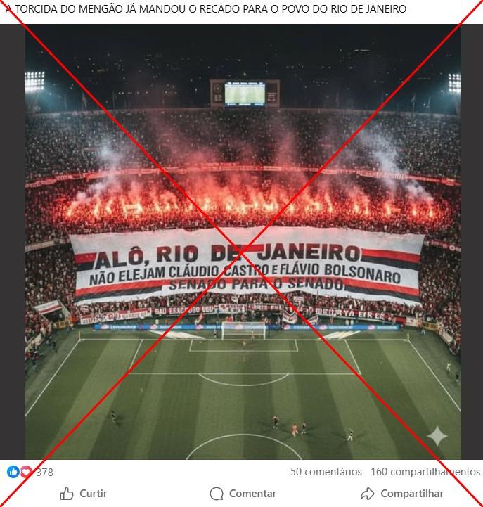 “A TORCIDA DO MENGÃO JÁ MANDOU O RECADO PARA O POVO DO RIO DE JANEIRO”, diz uma das publicações que compartilham a imagem no Facebook, no Instagram e no Threads. Nela, um suposto bandeirão exibe a mensagem: “Alô, Rio de Janeiro não elejam Cláudio Castro e Flávio Bolsonaro para o senado”.