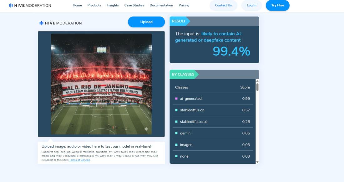 O AFP Checamos também submeteu a imagem à ferramenta Hive Moderation, que detecta o uso de IA em conteúdos. A plataforma indicou 99,4% de manipulação.