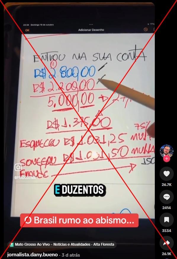 “Vou te mostrar o que vai acontecer com a nova regra do Pix com quem movimenta R$ 5 mil”, diz um homem em uma gravação publicada no Facebook, no Instagram e no TikTok. “1º de janeiro, nova regra do Pix. Se movimentar R$ 5 mil paga 27,5% de imposto de renda”, afirma.