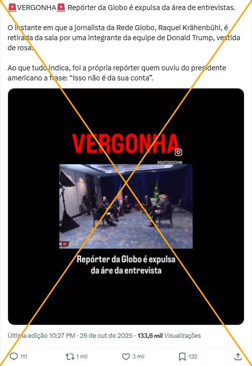 “VERGONHA Repórter da Globo é expulsa da área de entrevistas. O instante em que a jornalista da Rede Globo, Raquel Krähenbühl, é retirada da sala por uma integrante da equipe de Donald Trump, vestida de rosa. Ao que tudo indica, foi a própria repórter quem ouviu do presidente a frase: ‘Isso não é da sua conta’”, diz a legenda de um vídeo que circula no Instagram, no Facebook, no X, no Threads, no Telegram e no TikTok.