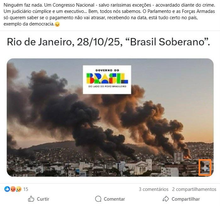 Uma outra imagem de colunas de fumaça preta sobre casas circula com a legenda “Rio de Janeiro, 28/10/25, ‘Brasil Soberano’” no Facebook, no Instagram, no Threads e no X, sendo associada à operação policial no Rio de Janeiro.