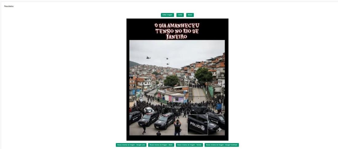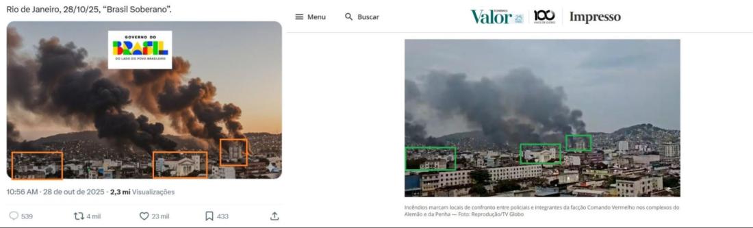 Uma busca pela imagem no Google Lens exibiu uma reportagem do Valor Econômico, publicada em 29 de outubro de 2025, com a legenda: “Incêndios marcam locais de confronto entre policiais e integrantes da facção Comando Vermelho nos complexos do Alemão e da Penha”, mostrando imagem semelhante à viralizada, creditada à TV Globo.