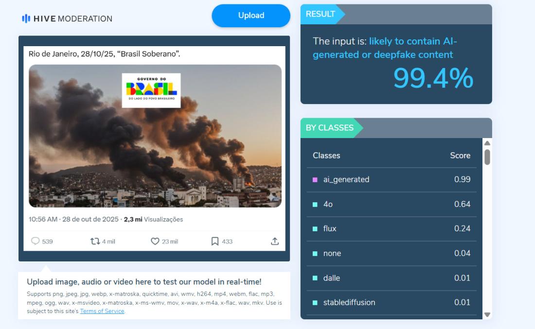 O Checamos submeteu a imagem à ferramenta de detecção IA Hive Moderation. A plataforma indicou 99,4% de manipulação.