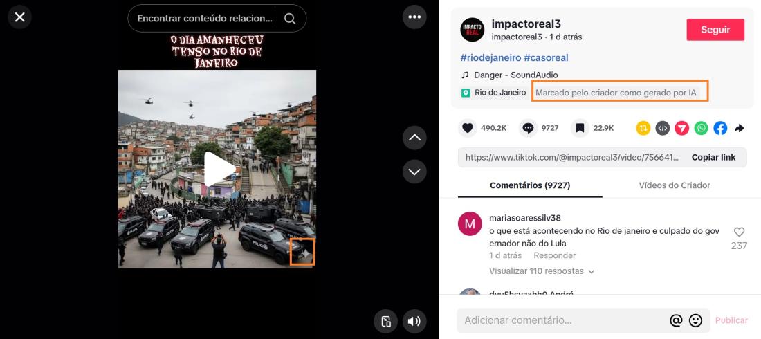 Uma nova busca no Google Lens pela imagem exibiu um vídeo no TikTok, publicado pelo usuário “@impactoreal3” em 29 de outubro de 2025, com as hashtags “#riodejaneiro” e “#casoreal”, sugerindo se tratar de uma imagem verídica na capital fluminense. Contudo, o registro está sinalizado como “Marcado pelo criador como gerado por IA”.
