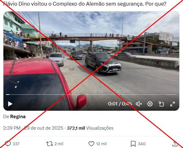“Flávio Dino visitou o Complexo do Alemão sem segurança. Por que?”, é a legenda de publicação no X. Conteúdo semelhante também circula no Facebook e no Threads, enquanto alguns posts fazem o mesmo questionamento, mas afirmando que a visita foi no Complexo da Maré.