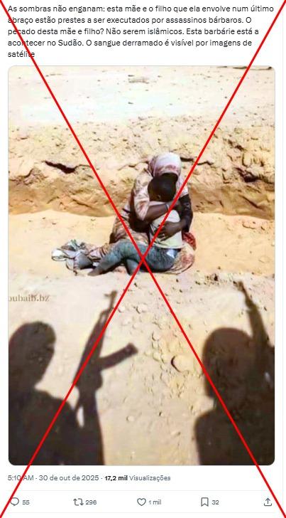 “As sombras não enganam: esta mãe e o filho que ela envolve num último abraço estão prestes a ser executados por assassinos bárbaros. O pecado desta mãe e filho? Não serem islâmicos. Esta barbárie está a acontecer no Sudão. O sangue derramado é visível por imagens de satélite”, diz a legenda de uma imagem de uma mãe abraçada com seu filho que circula no X.