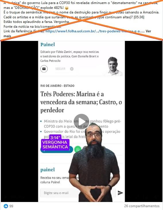 “A mídia (Folha/Painel) está comemorando que Marina Silva é a ‘vencedora da semana’ porque o ‘desmatamento’ caiu. Parece ótimo, né? O problema é que isso é uma manipulação grosseira. Para fazer esse número cair, eles simplesmente jogaram a destruição real para outra categoria: ‘DEGRADAÇÃO’”, diz a legenda de uma publicação que circula no Instagram e no Facebook. Alegações semelhantes circulam no X.