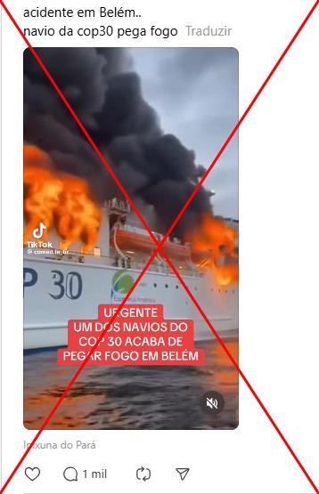 “URGENTE UM DOS NAVIOS DO COP 30 ACABA DE PEGAR FOGO EM BELÉM”, diz legenda sobreposta a um vídeo que circula no Instagram, no Facebook, no Threads e no TikTok.