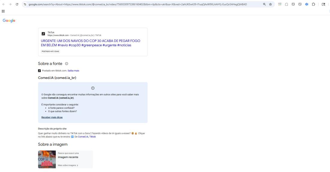 Outra busca no Google com o mesmo nome de usuário e os termos “navio” e “cop30” mostrou que, de fato, havia uma publicação na conta com a mesma sequência viral de um navio em chamas na COP30.