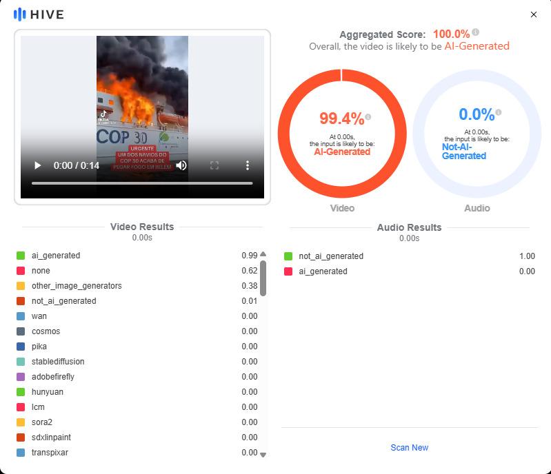 Vídeo produzido por inteligência artificial é difundido como se mostrasse incêndio em navio na COP30