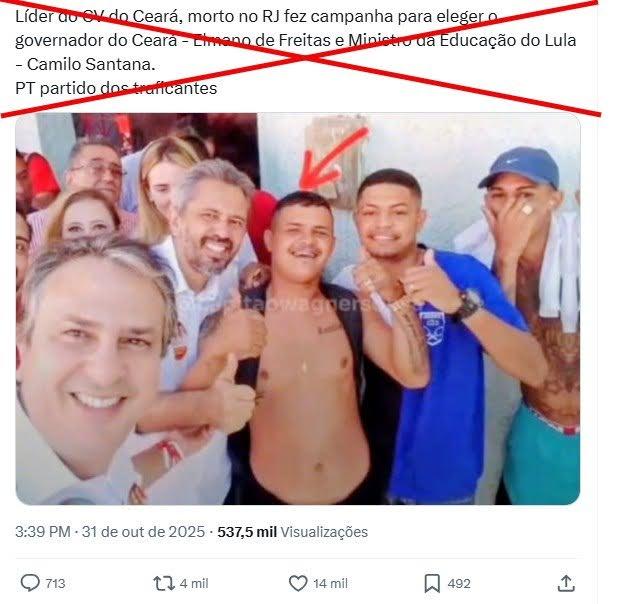 Semanas após a megaoperação contra o Comando Vermelho (CV), em 28 de outubro de 2025 no Rio de Janeiro, a ação continua gerando desinformação nas redes sociais. Não é verdade, como afirmam publicações com mais de 20 mil interações, que uma imagem mostre o governador do Ceará, Elmano de Freitas (PT), e o ministro da Educação, Camilo Santana (PT), com o suposto líder do CV no Ceará que teria morrido na ocasião. À AFP, a Secretaria da Casa-Civil do Estado negou a alegação, e um laudo pericial também descartou essa possibilidade.