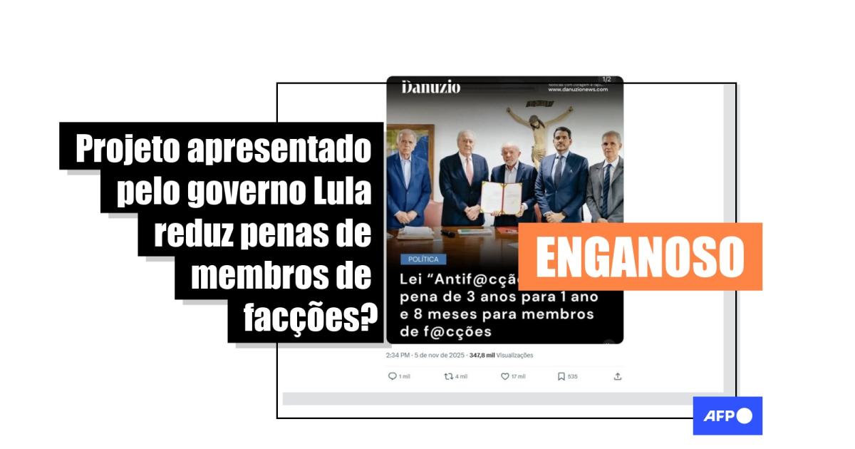 Em meio à falta de consenso entre a oposição e o governo federal para a redação final do texto do Projeto de Lei Antifacção, apresentado em 31 de outubro pelo Executivo, publicações nas redes sociais com mais de 50 mil interações alegam que a proposta reduz de 3 anos para 1 ano e 8 meses a pena para membros de facções criminosas. Na realidade, o projeto aumenta a pena atual de 3 a 8 anos para 5 a 10 anos e mantém reduções já previstas na legislação atual, como em casos de réu primário e de bons antecedentes.