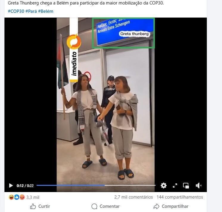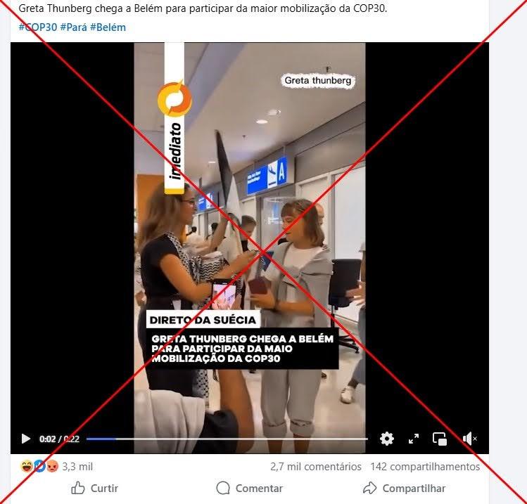 “Greta Thunberg chega a Belém para participar da maior mobilização da COP30”, diz a mensagem sobreposta ao vídeo que circula no Facebook, no Instagram e no X. Algumas postagens criticam o fato de Thunberg supostamente ter chegado de avião a uma cúpula climática.