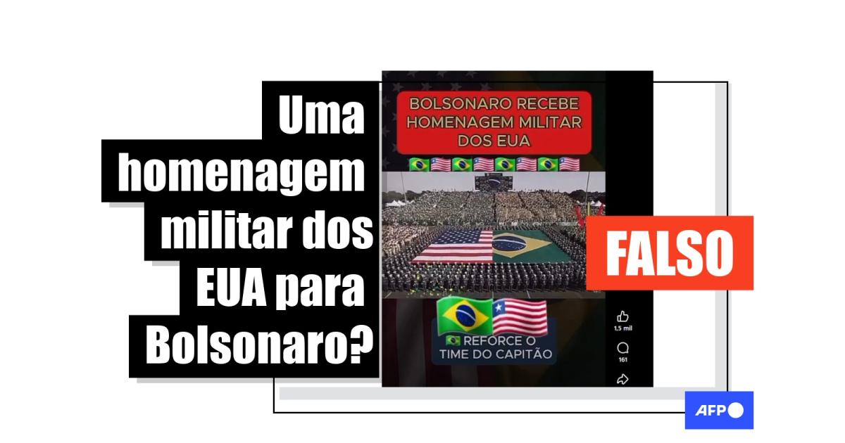 “BOLSONARO RECEBE HOMENAGEM MILITAR DOS EUA”, diz uma legenda sobreposta a um vídeo que circula no Instagram, no Facebook e no TikTok.