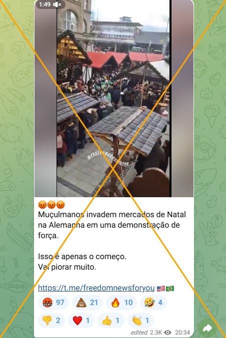 “Muçulmanos invadem mercados de Natal na Alemanha em uma demonstração de força. Isso é apenas o começo. Vai piorar muito”, diz uma das publicações compartilhadas no Facebook, no Instagram, no Threads e no Telegram.