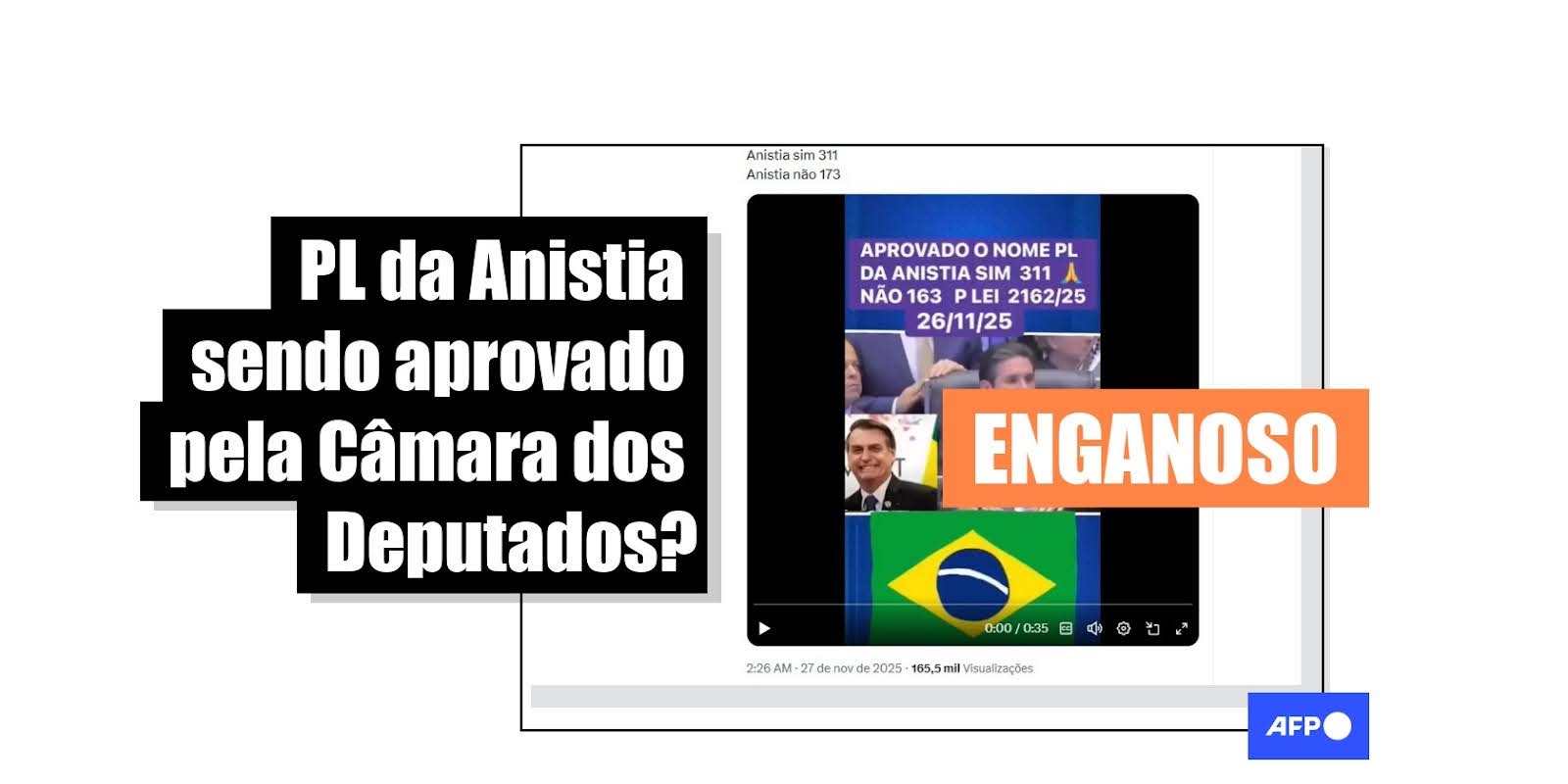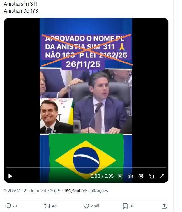 “APROVADO O NOME PL DA ANISTIA SIM 311 NÃO 163. P LEI 2162/25 26/11/25”, diz a mensagem sobreposta à gravação que circula no X, no Instagram e no Facebook.