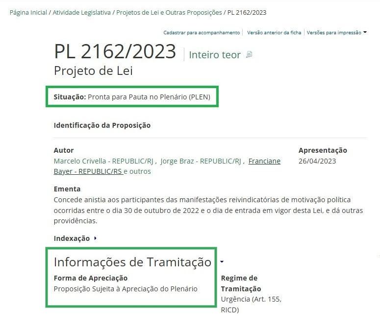 Uma consulta ao portal da Câmara dos Deputados pelo Projeto de Lei 2162/2023 (PL da Anistia) comprovou que a proposta ainda não foi votada e, no momento, aguarda “apreciação do Plenário”.