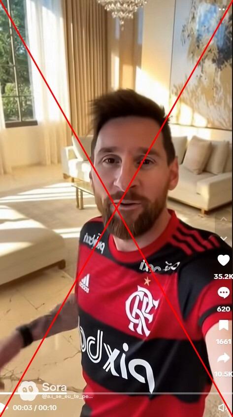 “Fala nação! Não consegui ir ao Aero Fla, com 'Papai Cris' e o 'Menino Ney'. Mas, estou aqui em casa mandando força para que o Mengão conquiste essa taça da Liberta”, Messi parece dizer no vídeo compartilhado no Facebook, no Instagram, no Kwai, no TikTok e no X.