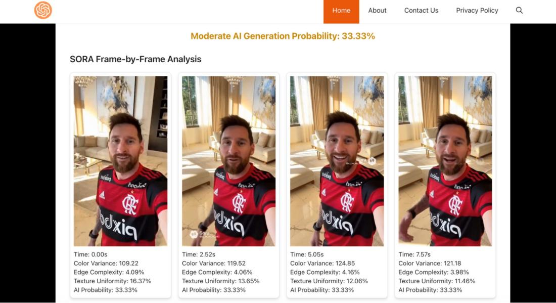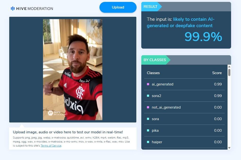 A AFP submeteu o vídeo ao Sora AI Detector, ferramenta que identifica conteúdos criados com a inteligência artificial da Open AI. A análise indicou “probabilidade moderada de geração de IA”.