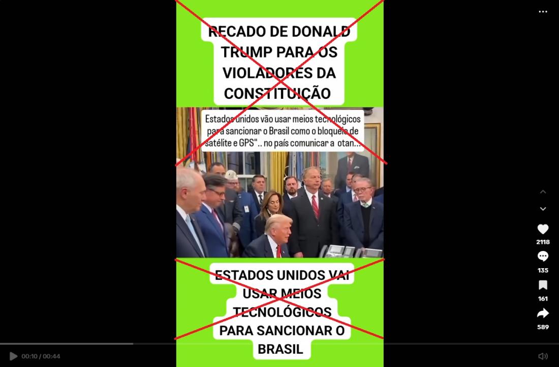Mas a sequência viralizada não mostra Trump declarando que irá sancionar o satélite e GPS do Brasil em meio a esse contexto.