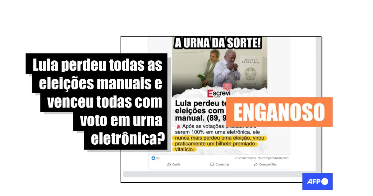 “Lula perdeu todas as eleições com votação manual. (89, 94 e 98) Após as votações presidenciais serem 100% em urna eletrônica, ele nunca mais perdeu uma eleição, virou praticamente um bilhete premiado vitalício”, diz uma publicação compartilhada no Facebook e no TikTok. Alegações semelhantes circulam no Instagram e no X.