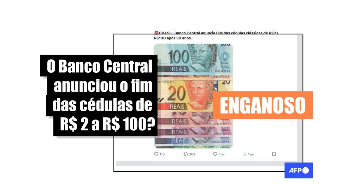 O Banco Central (BC) determinou em julho de 2024 que a rede bancária recolha as “cédulas nacionais legítimas da primeira família do Real” e as encaminhe para a instituição. Mais de um ano depois, posts que acumulam mais de 25 mil interações nas redes sociais desde 8 de dezembro de 2025 enganam ao afirmar que o BC anunciou o fim das notas de R$ 2 a R$ 100. A autarquia explicou à AFP que as cédulas permanecem válidas e que o objetivo da normativa é eliminar as cédulas “desgastadas que dificultam a verificação de autenticidade”.