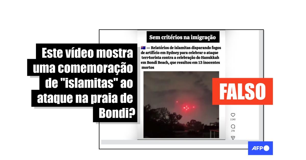 Um ataque a tiros durante uma festividade judaica na praia de Bondi, em Sydney, deixou 15 mortos e dezenas de feridos em 14 de dezembro de 2025. Desde então, publicações visualizadas mais de 475 mil vezes nas redes sociais compartilham um vídeo de fogos de artifício com a alegação de ser uma celebração de “islamistas” após o atentado. Mas isso é falso: um clube comunitário australiano confirmou à AFP que a exibição fez parte de um evento de Natal anual planejado com meses de antecedência e “sem qualquer relação” com o ataque em Bondi.