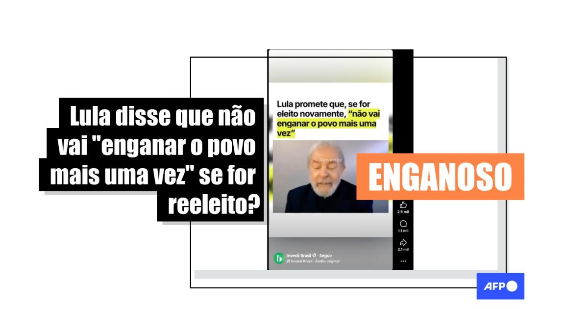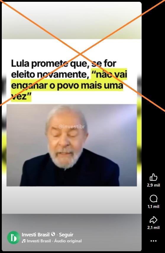 “Lula promete que, se for eleito novamente, ‘não vai enganar o povo mais uma vez’”, lê-se em um vídeo que circula no Facebook, no Instagram e no TikTok.
