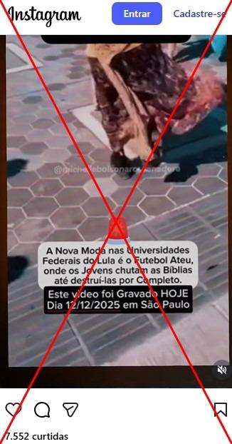 “A nova moda nas universidades federais do Lula é o futebol ateu, onde os jovens chutam as Bíblias até destruí-las por completo. Esse vídeo foi gravado hoje, dia 12/12/2025, em São Paulo” é a frase sobreposta ao vídeo compartilhado no Facebook, no Instagram e no Threads.
