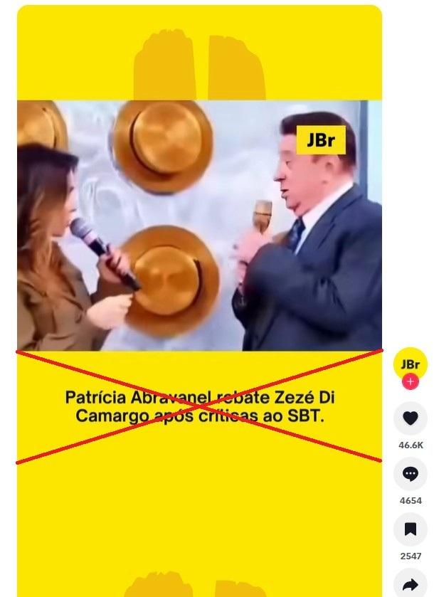 “Patrícia Abravanel rebate Zezé Di Camargo após críticas ao SBT” é a frase sobreposta a vídeo compartilhado no Instagram e no TikTok. Conteúdo semelhante circula no Facebook e no Kwai.
