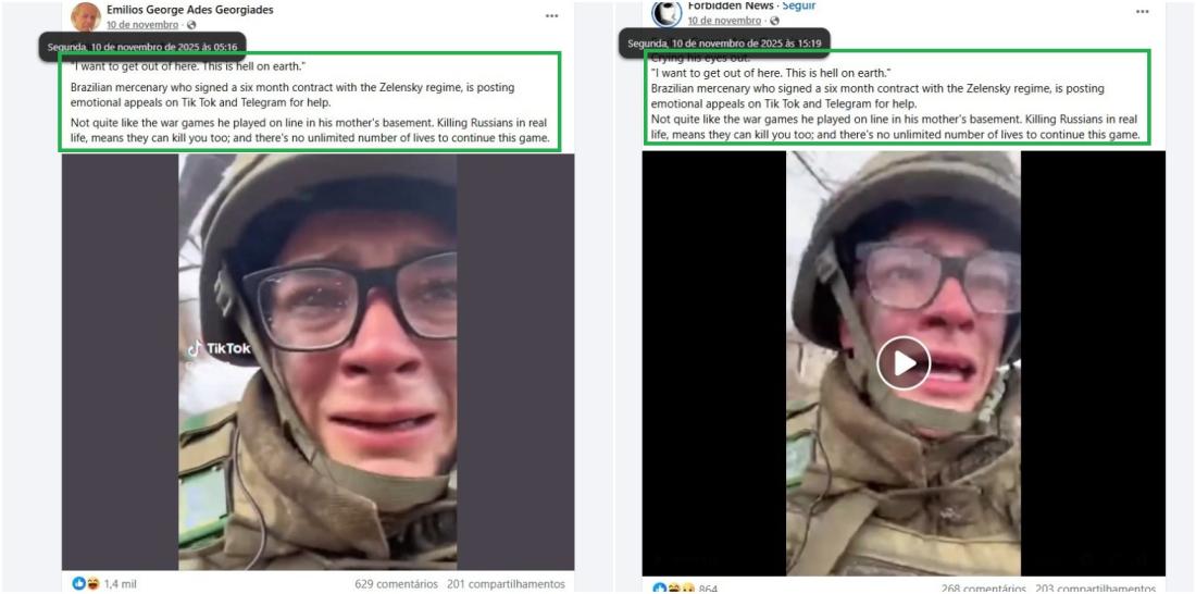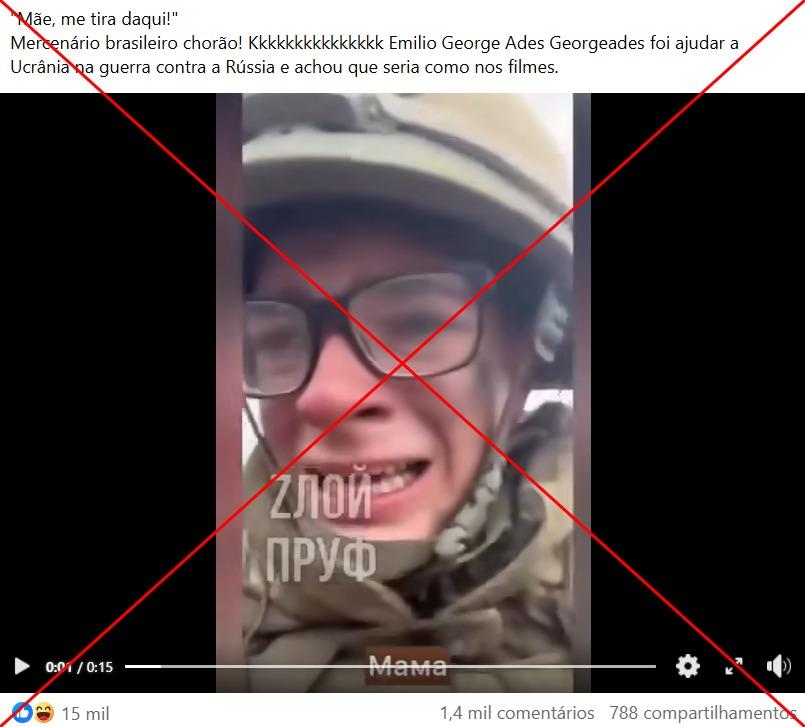 A alegação é compartilhada junto a um vídeo de 15 segundos em que um homem com vestimentas militares diz: “Mãe, pelo amor de Deus, eu não deveria ter vindo! Eu tô aqui, mãe. Tá caindo bomba pra tudo que é lado. Eu tô sozinho, mãe. Me tira daqui. Eu sou burro demais! Achei que ia ser filme. Eu não consigo, mãe”.