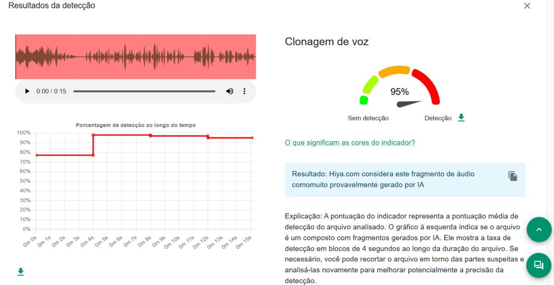 De maneira similar, uma análise do áudio, feita com a ferramenta Hiya do InVID WeVerify, indicou 95% de probabilidade de ter sido gerado por inteligência artificial.