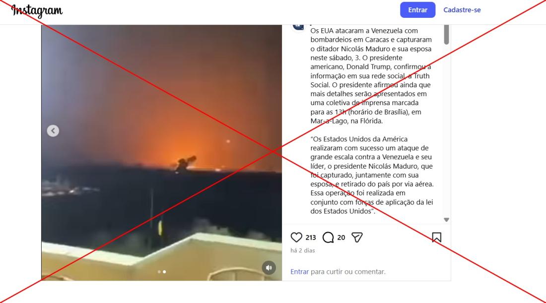 O presidente deposto da Venezuela, Nicolás Maduro, e sua esposa, Cilia Flores, foram capturados por forças especiais dos Estados Unidos na madrugada de 3 de janeiro de 2026, em meio a bombardeios que surpreenderam os moradores da capital Caracas. Após a operação, imagens falsamente atribuídas à ação ou à reação da população circularam nas redes sociais, além de uma foto do líder venezuelano capturado produzida com inteligência artificial (IA). A seguir, um compilado dos conteúdos verificados pela AFP.