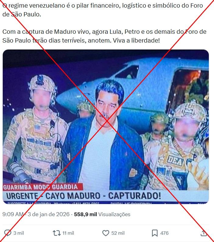 Maduro foi capturado pela Delta Force, tropa de elite do exército norte-americano, não pela Administração de Repressão às Drogas (DEA, na sigla em inglês), como sugere o conteúdo compartilhado nas redes sociais. Há registros da imprensa (1, 2, 3) do presidente deposto sendo conduzido por agentes da DEA ao desembarcar nos Estados Unidos – mas as vestimentas dos agentes também diferem do registro viral.