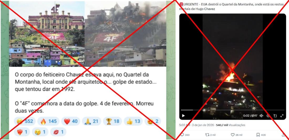“URGENTE - EUA destrói o Quartel da Montanha, onde está os restos mortais de Hugo Chavez”, diz uma das publicações que compartilham um vídeo de um edifício em chamas no Facebook, no Instagram, no X, no Telegram e no TikTok.