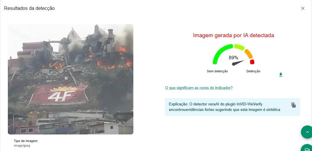Outras publicações compartilham uma suposta fotografia do Quartel da Montanha parcialmente destruído. Entretanto, uma análise com o plugin de verificação InVID-WeVerify encontrou uma alta probabilidade, de 89%, de a imagem ter sido criada com inteligência artificial (IA).