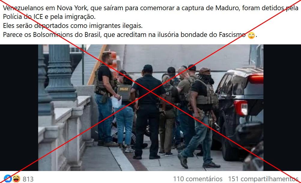 “Venezuelanos que estavam em Nova York saíram para comemorar a captura de Maduro e foram presos pelo ICE (Serviço de Imigração e Alfândega dos Estados Unidos). Eles serão deportados por serem imigrantes ilegais”, é a frase sobreposta a imagem no Instagram e no Threads. Conteúdo semelhante circula no Facebook, no X e em espanhol.