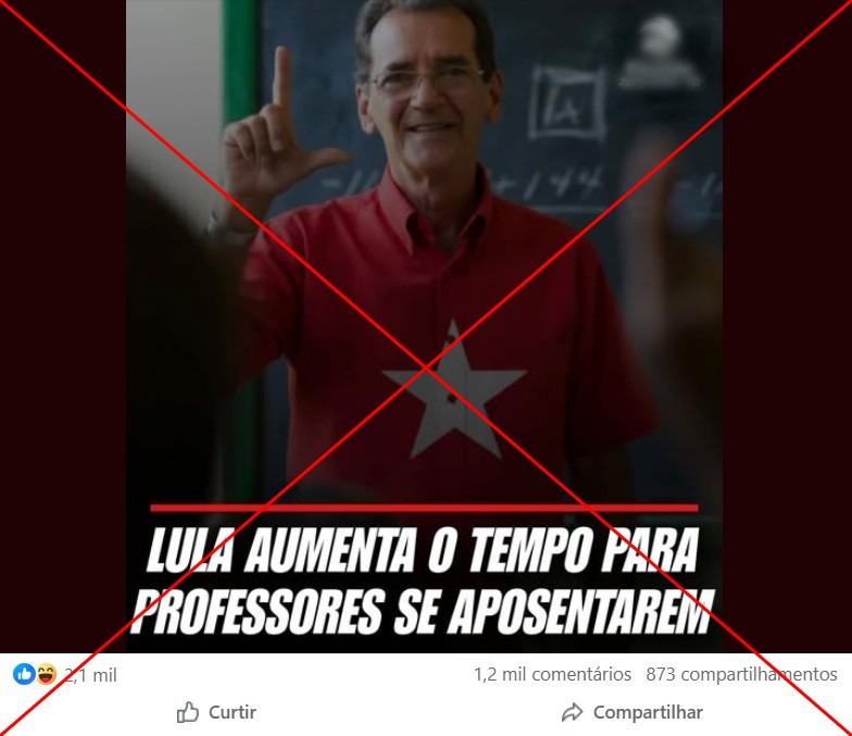 “Lula aumenta o tempo de aposentadoria dos professores”, diz uma das publicações compartilhadas no Instagram, no Facebook, no X, no Threads, no YouTube e no TikTok.