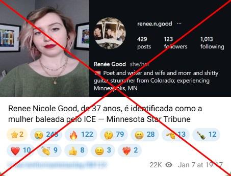 Após a vítima fatal de tiros disparados por um agente do Serviço de Imigração e Controle de Alfândega (ICE, na sigla em inglês) dos Estados Unidos ser identificada como Renee Nicole Good, publicações com mais de 22 mil de interações supostamente divulgam uma imagem da mulher. Mas entre as fotos que se espalharam online desde o início de janeiro de 2026, internautas compartilham erroneamente o registro de uma outra mulher sem qualquer relação com o episódio, Gabriela Szczepankiewicz.