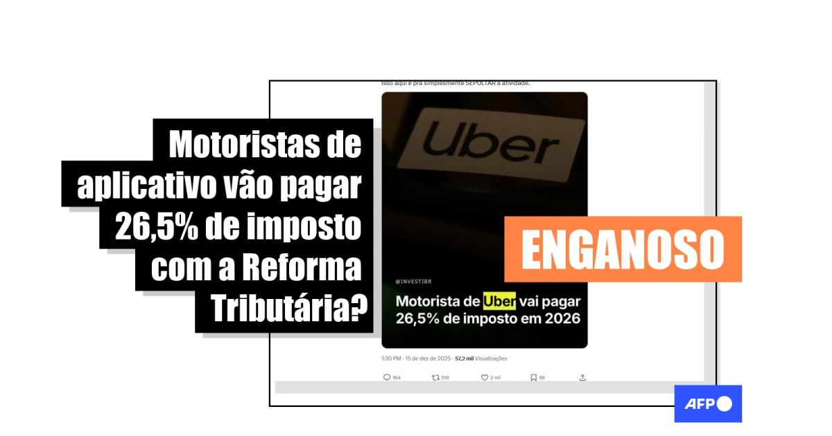 Com a aprovação da Reforma Tributária em 2023, dois novos impostos sobre bens e serviços serão implementados em fase de testes a partir de 2026. Nesse contexto, desde 13 de dezembro de 2025, publicações com mais de 45 mil interações nas redes sociais voltaram a alegar que, com as novas regras, motoristas de aplicativo passariam a pagar 26,5% de imposto. Mas isso é enganoso: os profissionais podem ser enquadrados como nanoempreendedores, isentos da tributação, ou optar pelos modelos de MEI ou Simples Nacional, ambos sob diferentes regras tributárias.