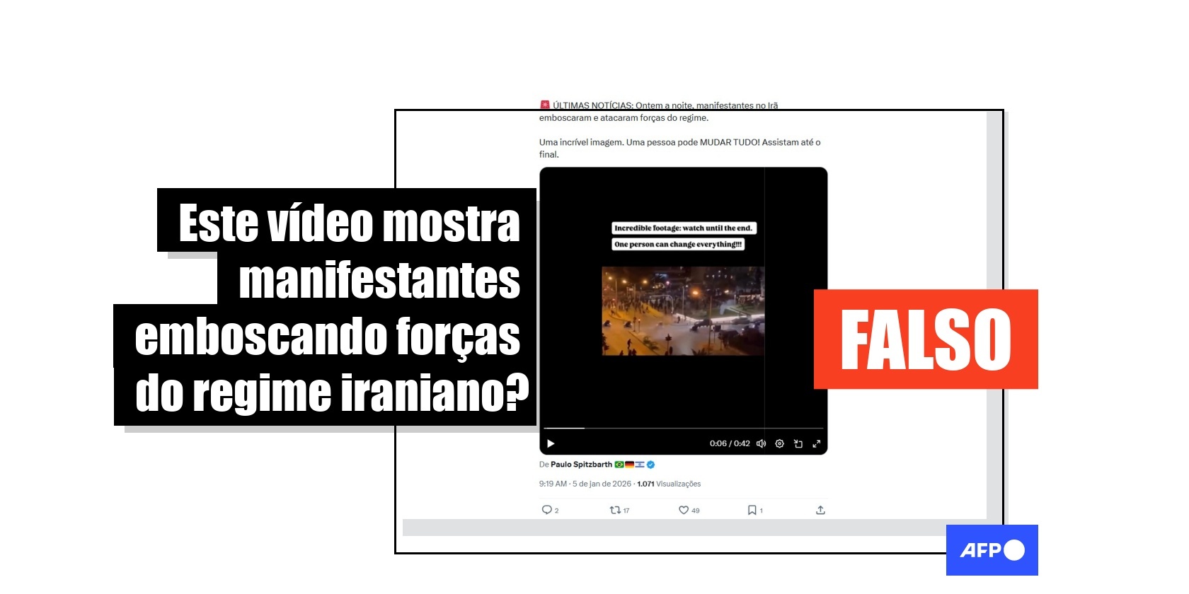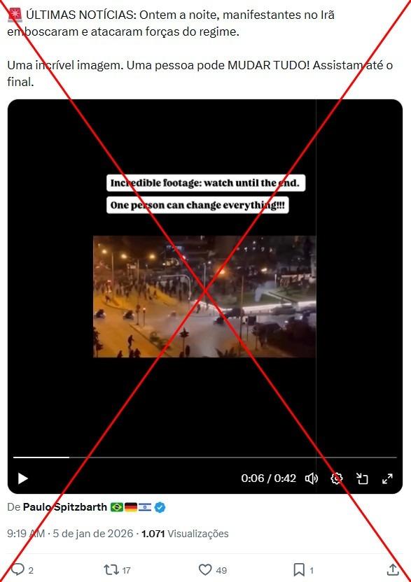 A República Islâmica do Irã vive, desde 28 de dezembro de 2025, protestos generalizados devido ao aumento do custo de vida e ao colapso do rial, a moeda nacional. Neste contexto, desde 5 de janeiro de 2026, um vídeo visualizado mais de 3 mil vezes nas redes sociais mostra uma emboscada de manifestantes contra policiais, sugerindo que o registro foi feito em meio à crise iraniana. No entanto, as imagens foram registradas durante um protesto na Grécia, em 2021.