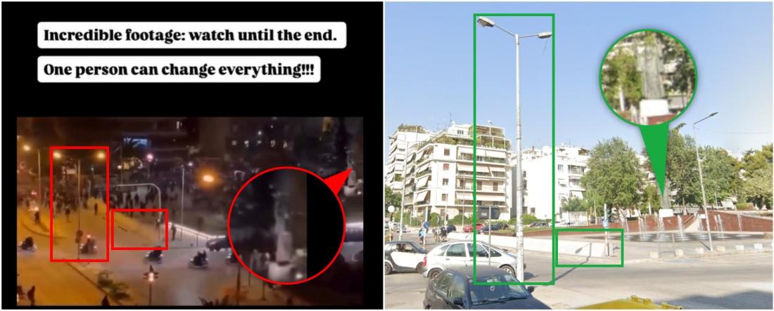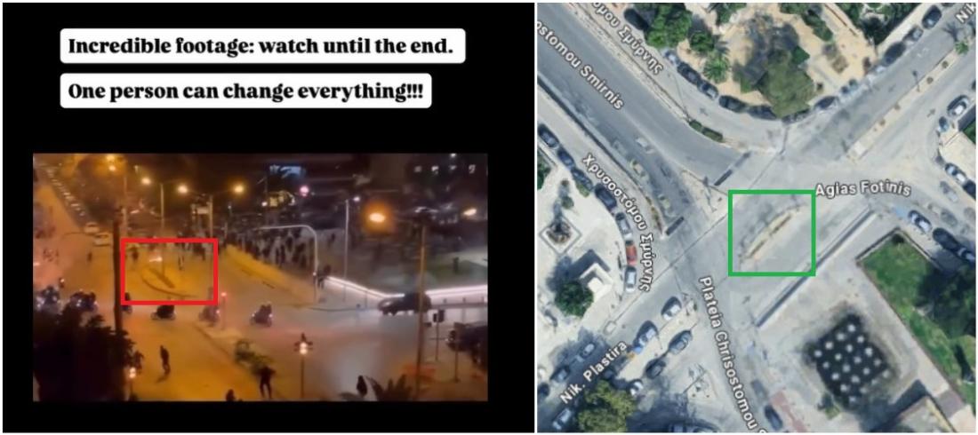 Uma pesquisa no Google Maps pela localização da delegacia de polícia de Nea Smirni e análise dos arredores mostra que o vídeo viralizado foi feito no cruzamento das ruas Nik. Plastira e Agias Fotinis, cerca de 500 metros da unidade policial. A imagem de satélite do Google Maps mostra uma avenida com o mesmo formato daquela que aparece no vídeo compartilhado nas redes sociais.