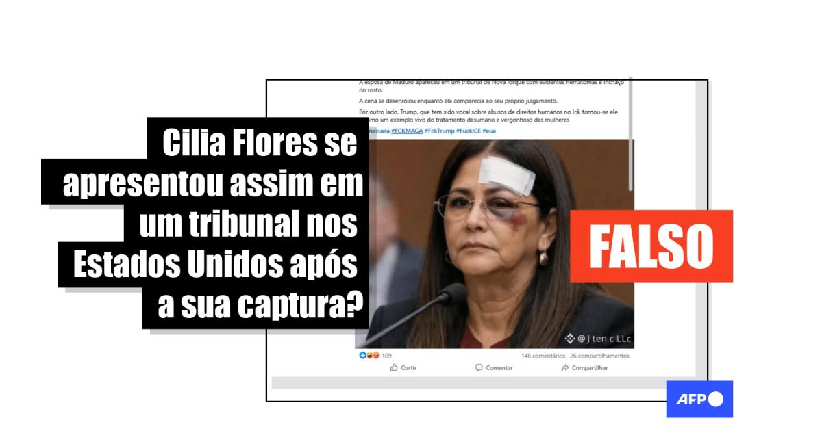 Após terem sido capturados por forças norte-americanas, o presidente deposto da Venezuela, Nicolás Maduro e sua esposa, Cilia Flores, compareceram em um tribunal em Nova York, em 5 de janeiro de 2026, onde se declararam inocentes das acusações. Neste contexto, publicações nas redes sociais com centenas de interações compartilham uma suposta imagem de Flores com um olho roxo e curativo no rosto. Mas os desenhos judiciais da audiência mostram que a imagem não é autêntica. Há também indícios de que foi produzida com inteligência artificial (IA).