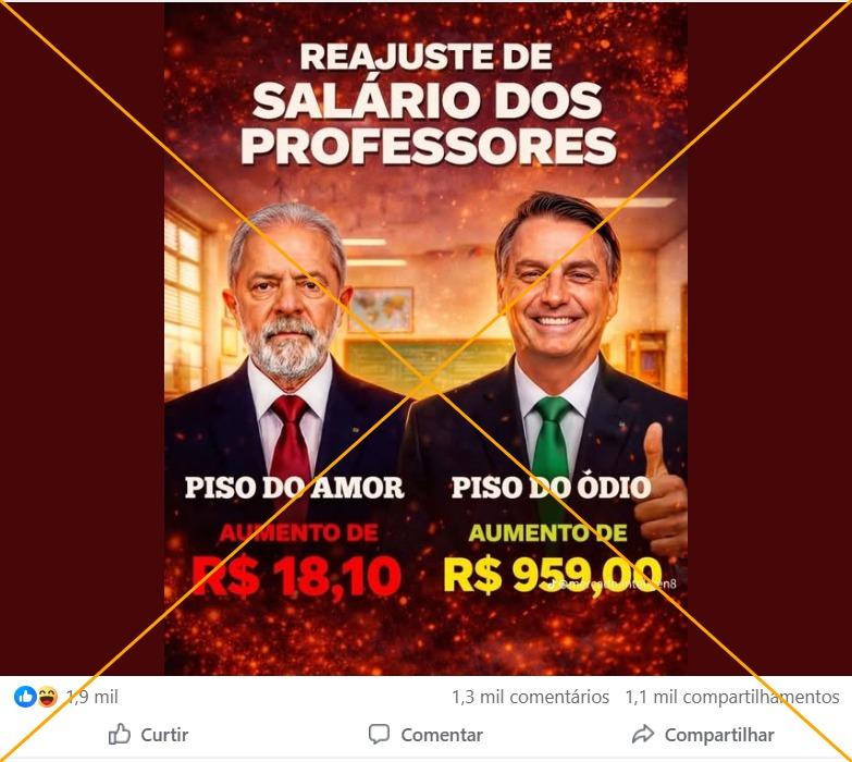 No início de janeiro de 2026, foi anunciado que o reajuste salarial dos profissionais da educação seria de cerca de R$ 18. Diante disso, publicações com mais de 44 mil interações nas redes sociais passaram a comparar esse valor com um aumento de R$ 959 concedido durante o mandato do ex-presidente Jair Bolsonaro. Mas as peças de desinformação omitem que, nesses dois casos, o reajuste salarial foi determinado por um cálculo estabelecido pela Lei do Piso do Magistério de 2008, não por decisão dos mandatários. Após críticas em 2026, o governo assinou uma Medida Provisória para mudar esse cálculo.