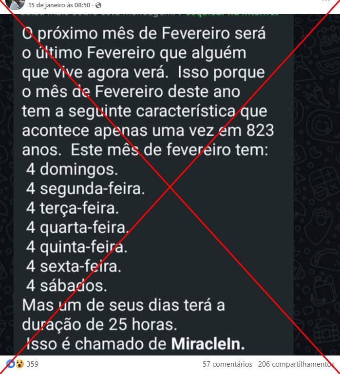 “O próximo mês de Fevereiro será o último Fevereiro que alguém que vive agora verá. Isso porque o mês de Fevereiro deste ano tem a seguinte característica que acontece apenas uma vez em 823 anos. Este mês de fevereiro tem: 4 domingos. 4 segunda-feira. 4 terça-feira. 4 quarta-feira. 4 quinta-feira. 4 sexta-feira. 4 sábados. Mas um de seus dias terá a duração de 25 horas. Isso é chamado de MiracleIn”, diz uma das publicações compartilhadas no Facebook, no Instagram, no Threads e no X.