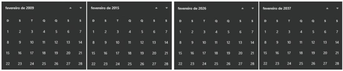 O site Time and Date (hora e data, em tradução livre para o português) lista todos os anos que tiveram o mesmo calendário de 2026, ou seja, cujo mês de fevereiro, por exemplo, começou em um domingo, terminou em um sábado e teve o mesmo número de dias.