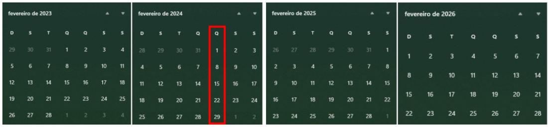 Ao observar o calendário de 2025 e dos anos anteriores a 2024, é possível perceber que os dias da semana se repetem quatro vezes no mês de fevereiro, desde que não seja um ano bissexto.