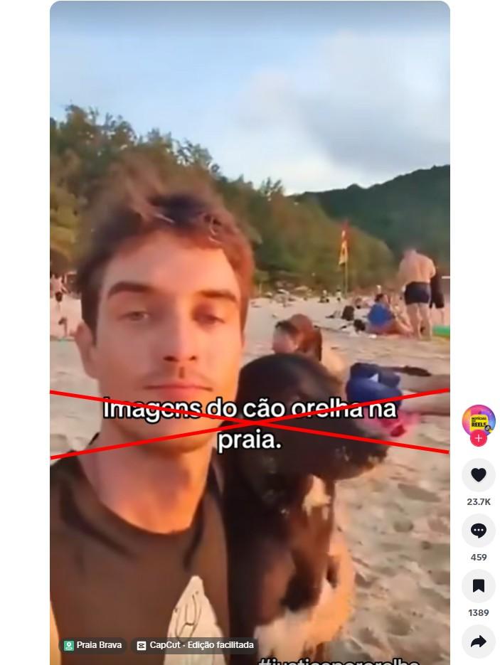 Desde o início de janeiro de 2026, usuários repercutem a morte de “Orelha”, cão comunitário de Praia Brava, em Florianópolis, que teria sido brutalmente agredido por um grupo de adolescentes. O caso gerou forte comoção e manifestações de políticos e celebridades, que pedem justiça pelo animal. Nesse contexto, um vídeo visualizado mais de 3,7 milhões de vezes nas redes sociais circula como se mostrasse Orelha observando um pôr do sol ao lado de um homem em uma praia de Florianópolis. Mas a gravação foi feita por um ator e modelo australiano na Tailândia em 2023 e mostra outro cão.